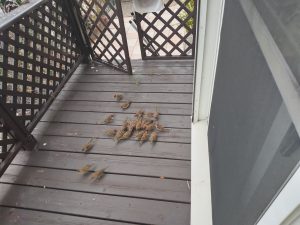 こんなことするの、初めて。ウッドデッキにちょっとだけ小鳥のフードを撒いて。