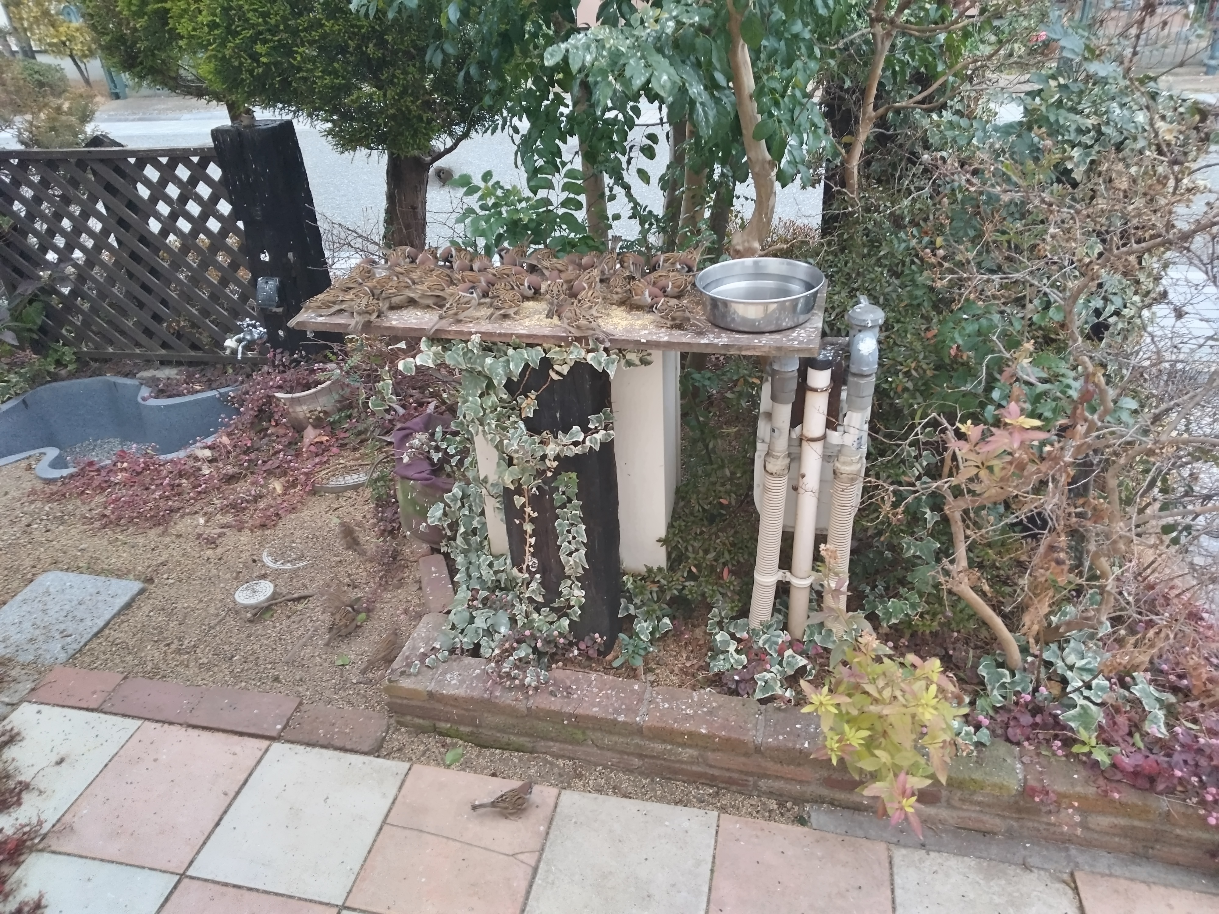 *トップの写真は、庭掃除も終わって九時過ぎ、スズメたちの第二回目の食事会。