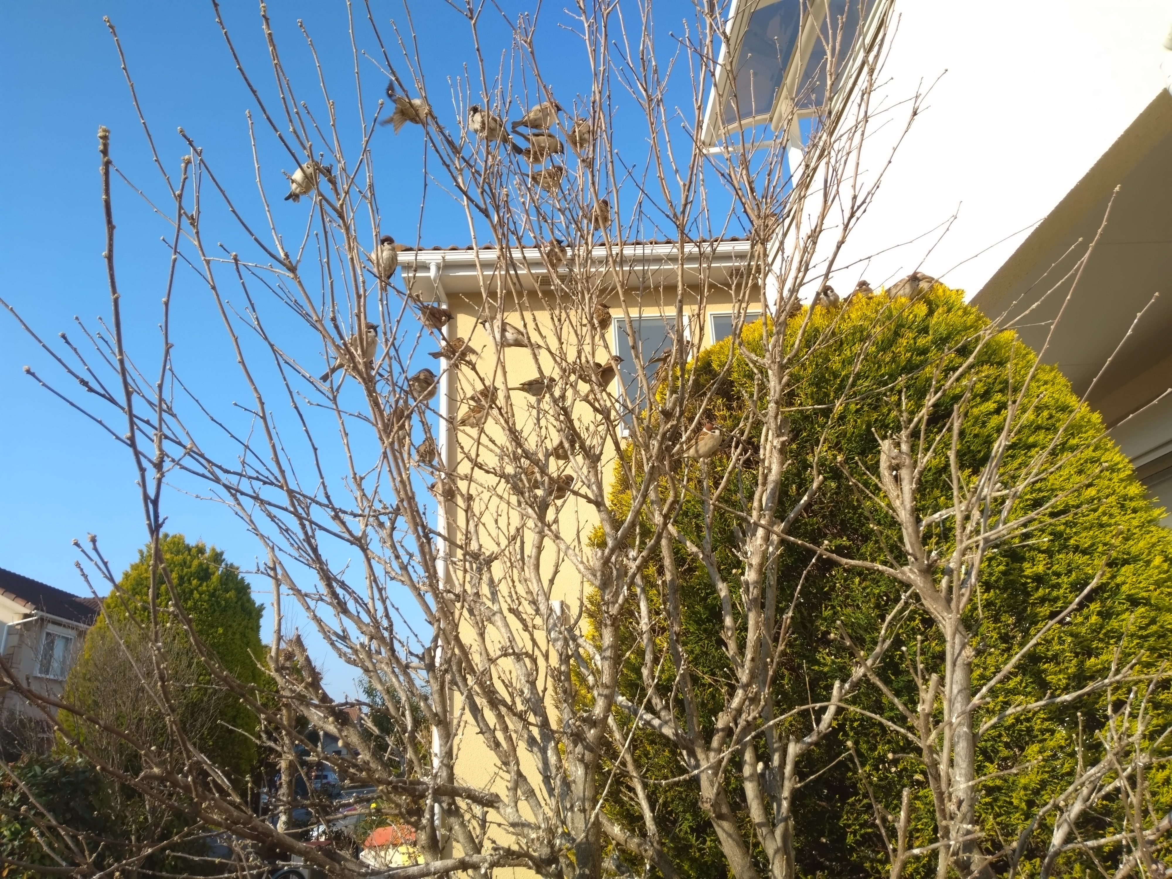 *トップの写真は、食事が終わった後、木にとまってくつろぐスズメたち。