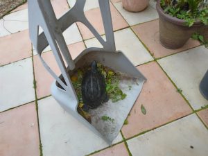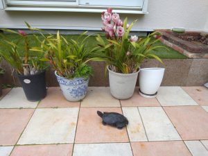 池の掃除が終わって、庭掃除をしていると、ウッドデッキの下に潜り込もうとしている。