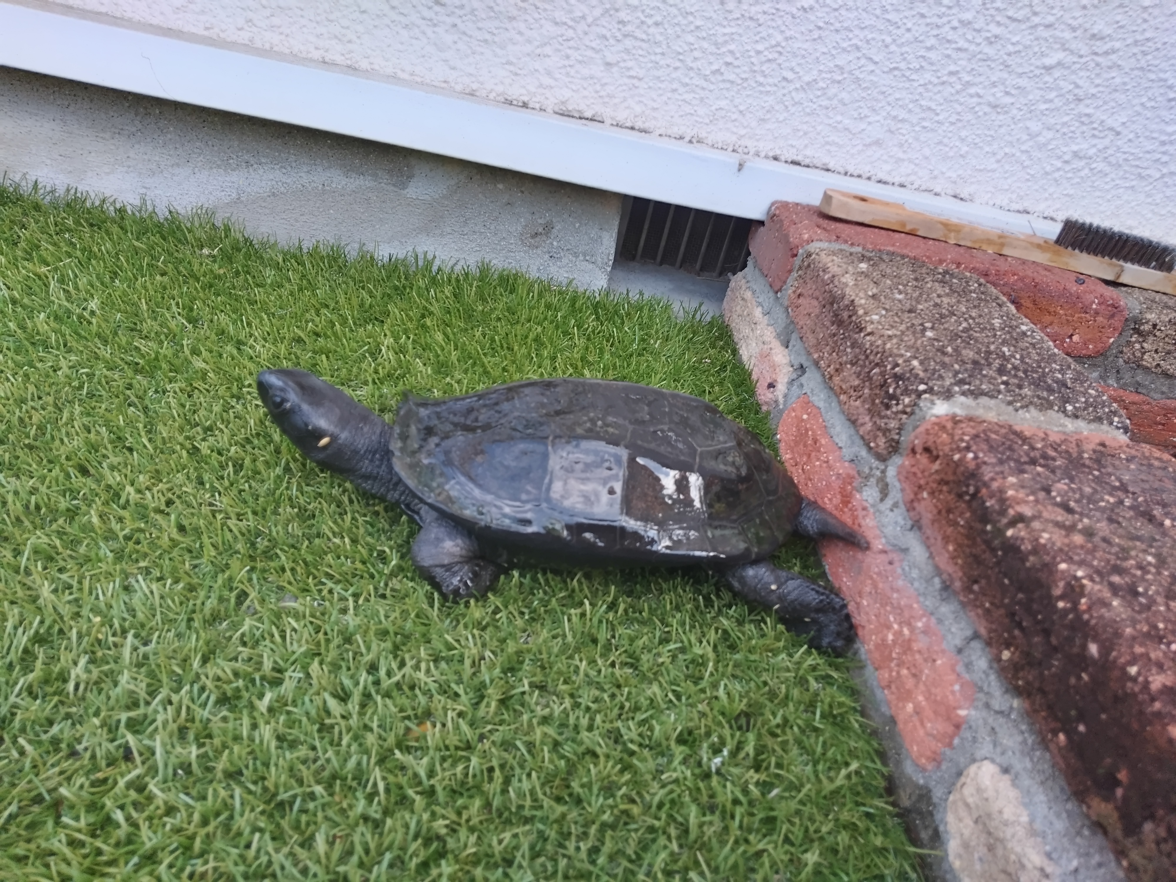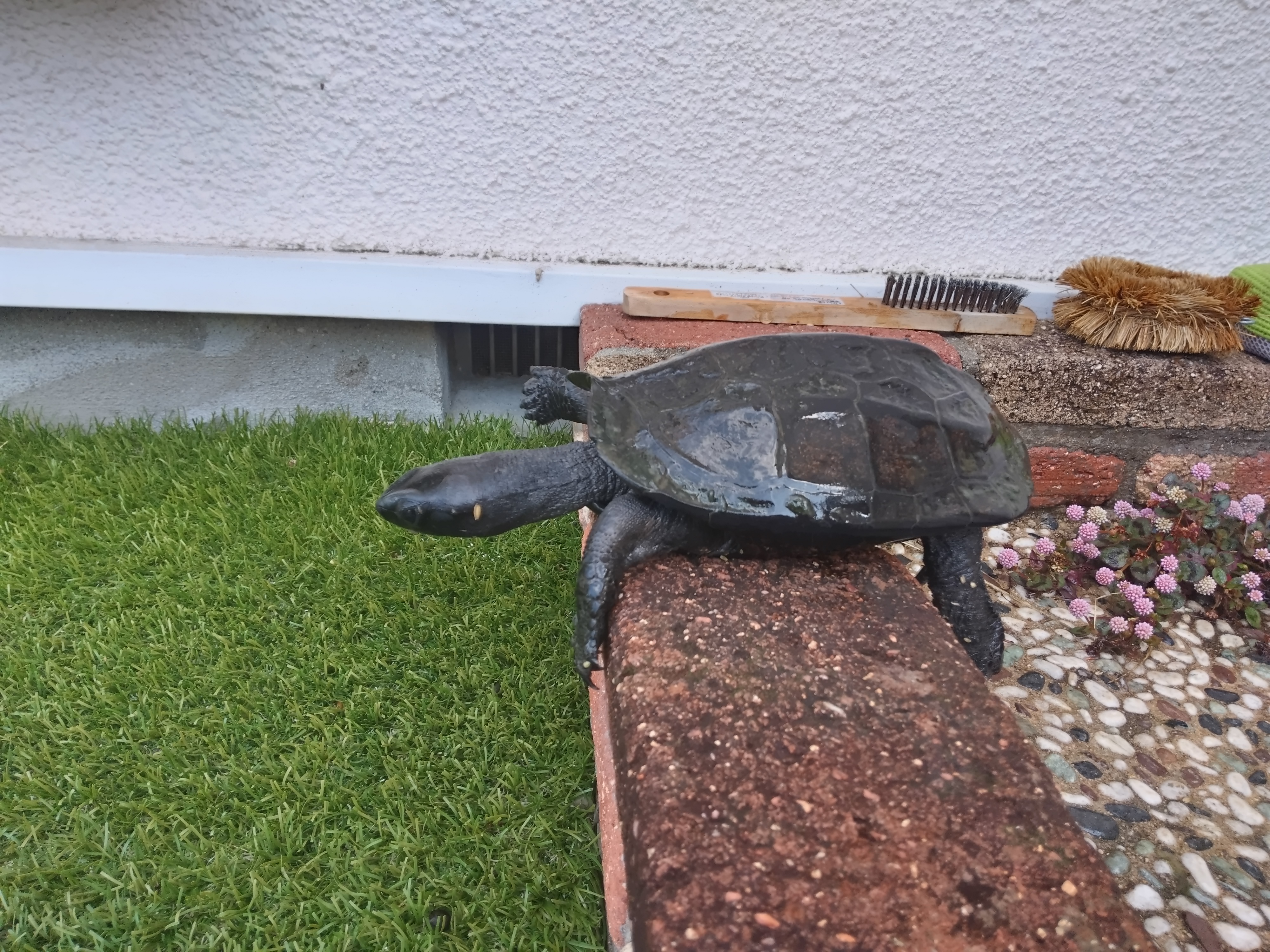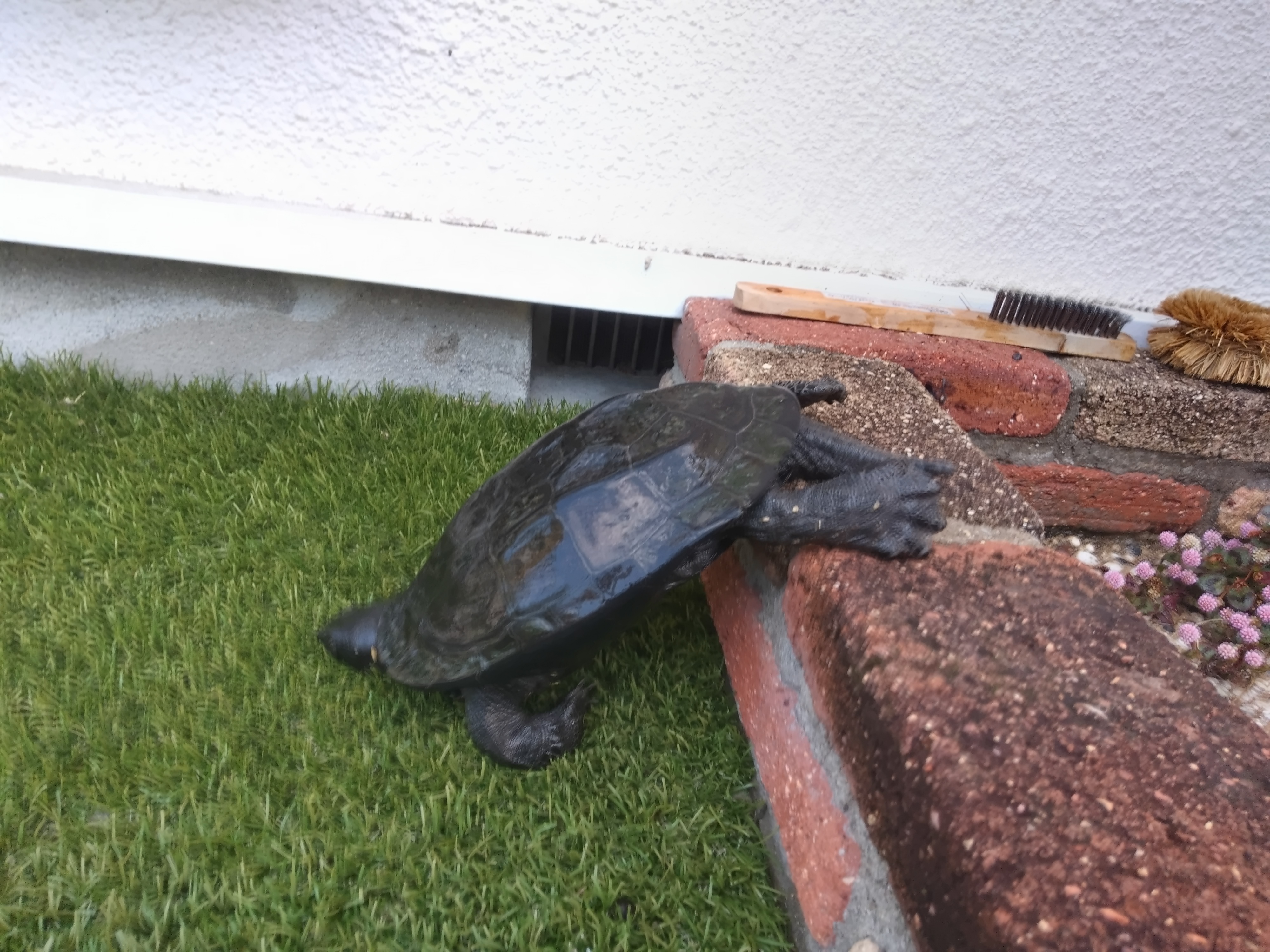 池の掃除が終わった後、亀の体をスポンジで綺麗にして、洗い場で遊ばせていると、彼は自力で洗い場を乗り越えてテラスへ向かった。その状況を四枚の写真でご覧いただきたい。