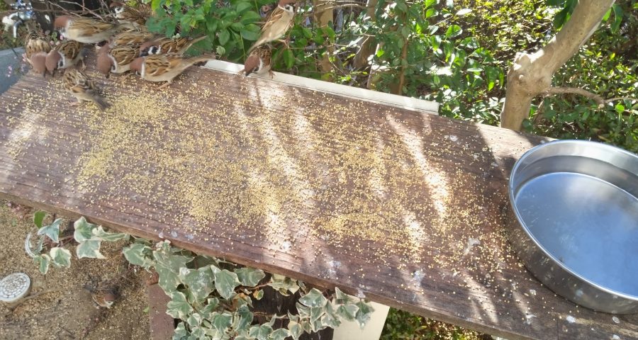 朝九時過ぎ、一階のダイニングからリビングへ、そして寝室へとシャッターをあげていくと、スズメたちが眼前を飛び交ったりして、空中を夢中で飛び回ったりして、朝ごはんの催促。 というのも、昨夜、習癖にまでなったスナックで酒を